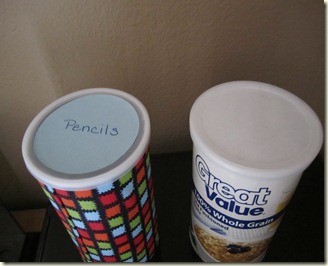 So I have been trying to figure out how to use our old oatmeal containers. One way I reuse them is to store colored pencils. Here I used an 18 oz canister and covered it with some scarp fabric. I ironed all the seams under then with a sponge coated the canister with mod podge and applied the fabric carefully. Now I have a place to store the boys colored pencils drawing time. Another use I have found with these is to cut a circle or slender rectangle in the lid with an X-Acto knife, then have the kids insert objects like poker chips, pencils, straws. This helps develop fine motor skills.